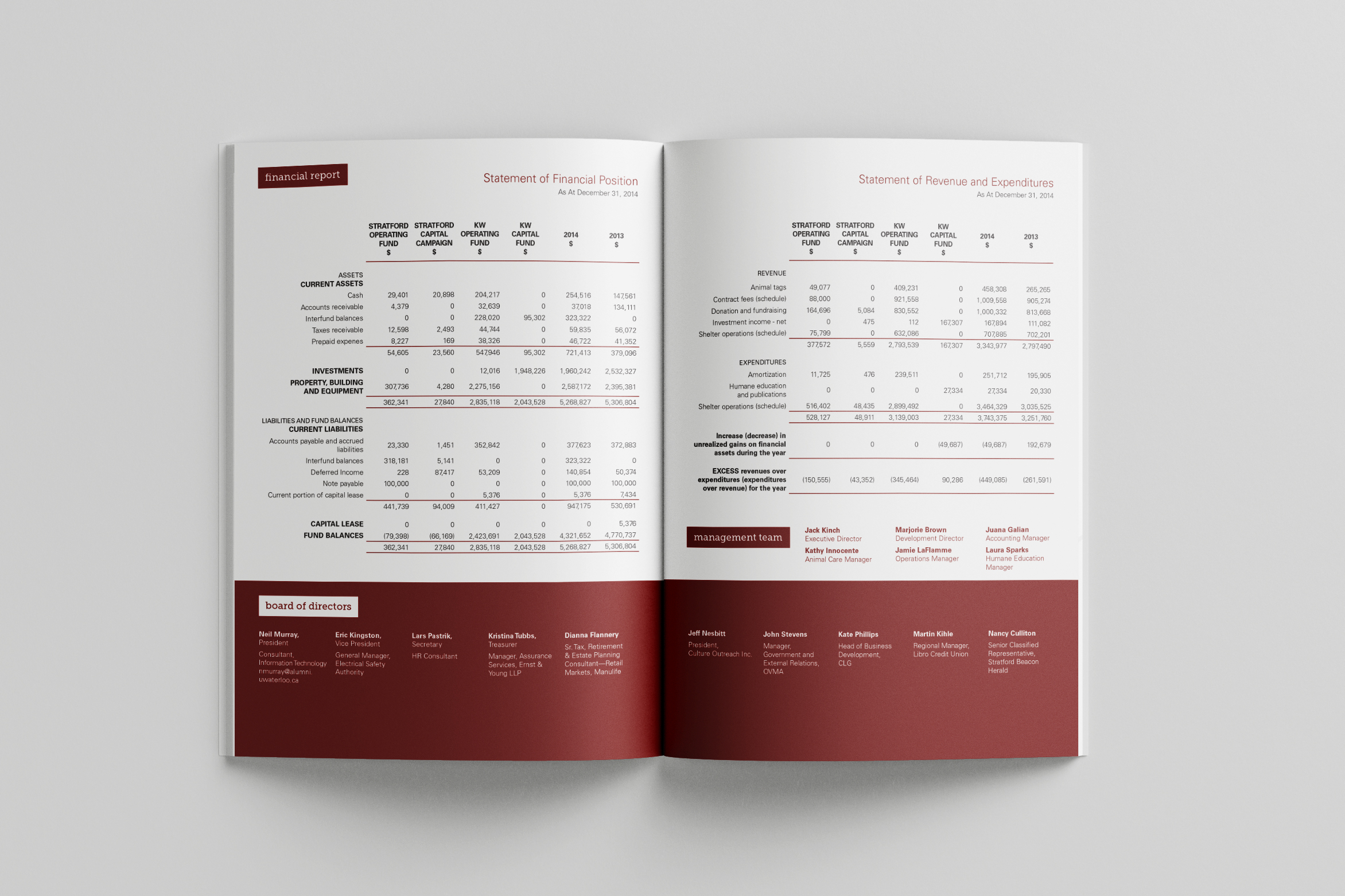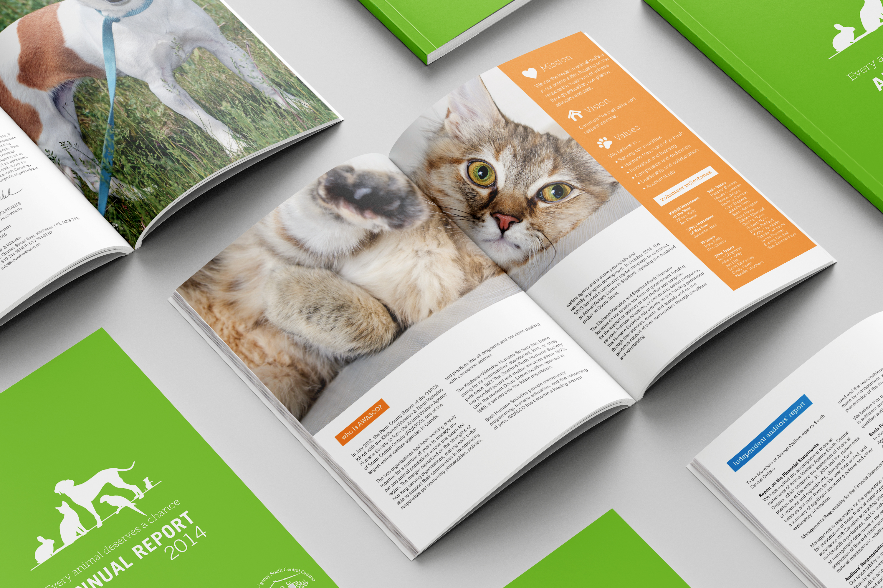 Animal Welfare Agency of South Central Ontario formed when the Kitchener Waterloo Humane Society and the Stratford Perth Humane Society merged. It is the largest animal welfare agency in Canada. They wanted an annual report that was bright, eye catching and featured some of their very own rescued animals.