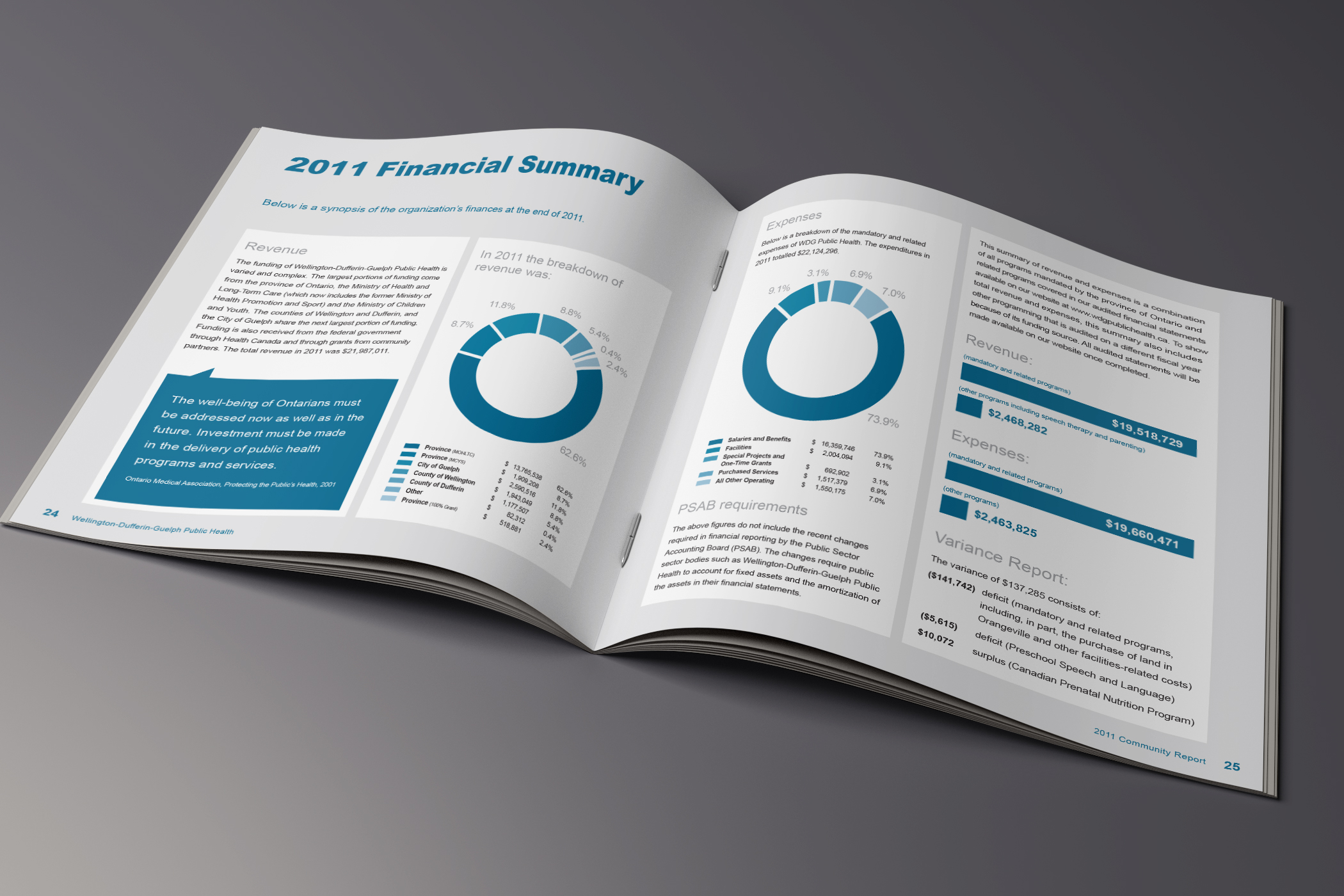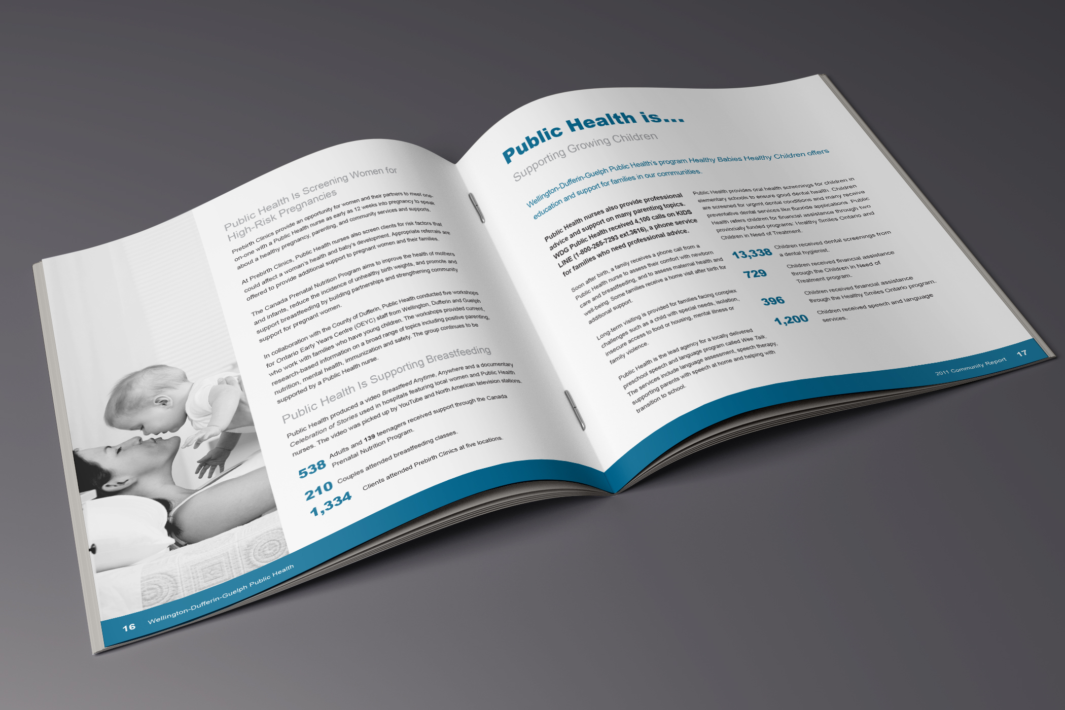 Wellington-Dufferin-Guelph Public Health requested a two-colour simple annual report using their brand colour. I used black and white images throughout the report with a lot of white/light grey space and focused on using their brand colour to highlight areas of interest and draw attention to specific numbers and quotes.