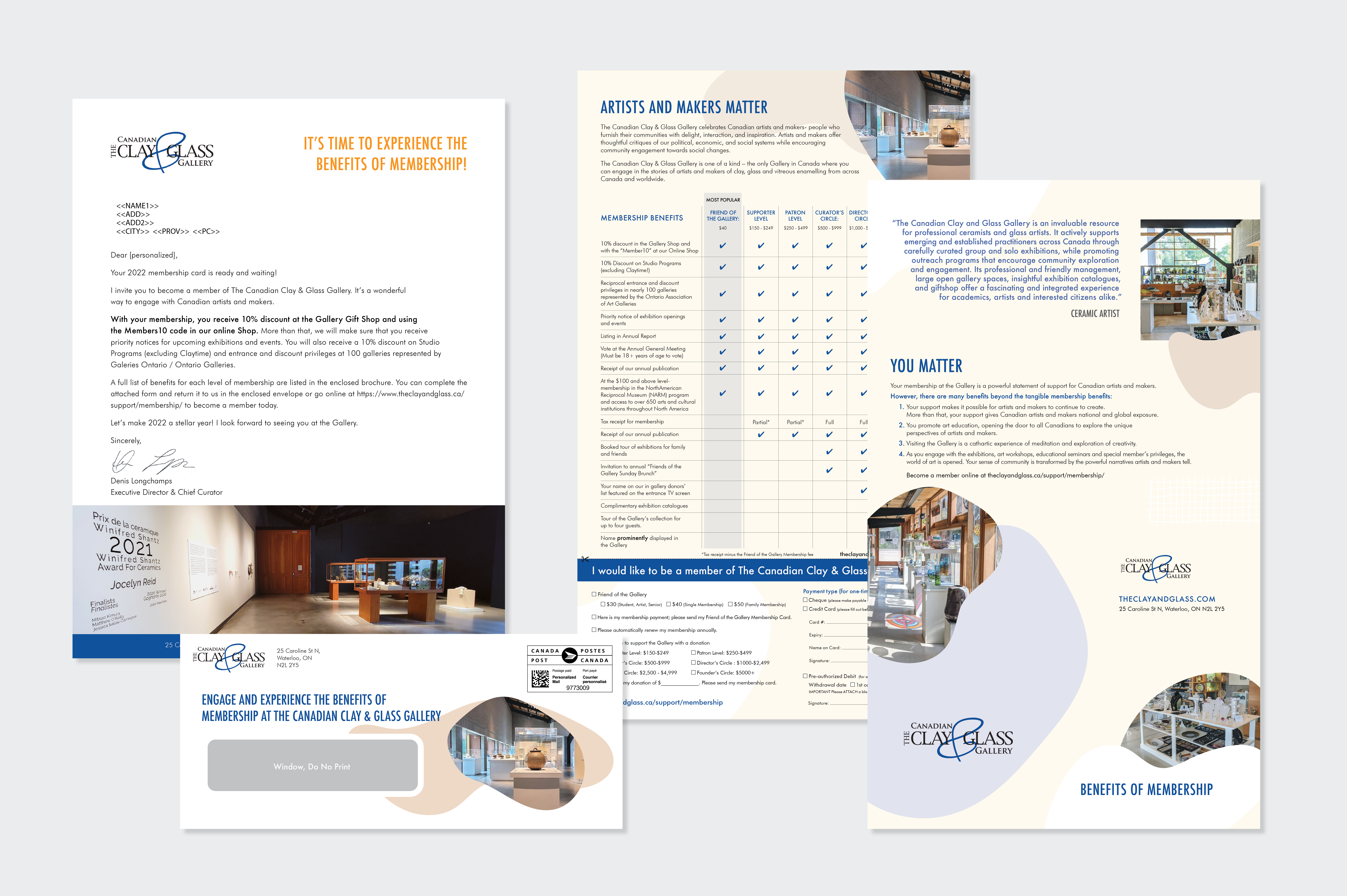 The Clay and Glass Gallery in Waterloo wanted to send out a direct mailing highlighting the benefits of membership. This direct mail piece included a personalized letter and outer envelope as well as a roll-folded information brochure detailing all their membership benefits.