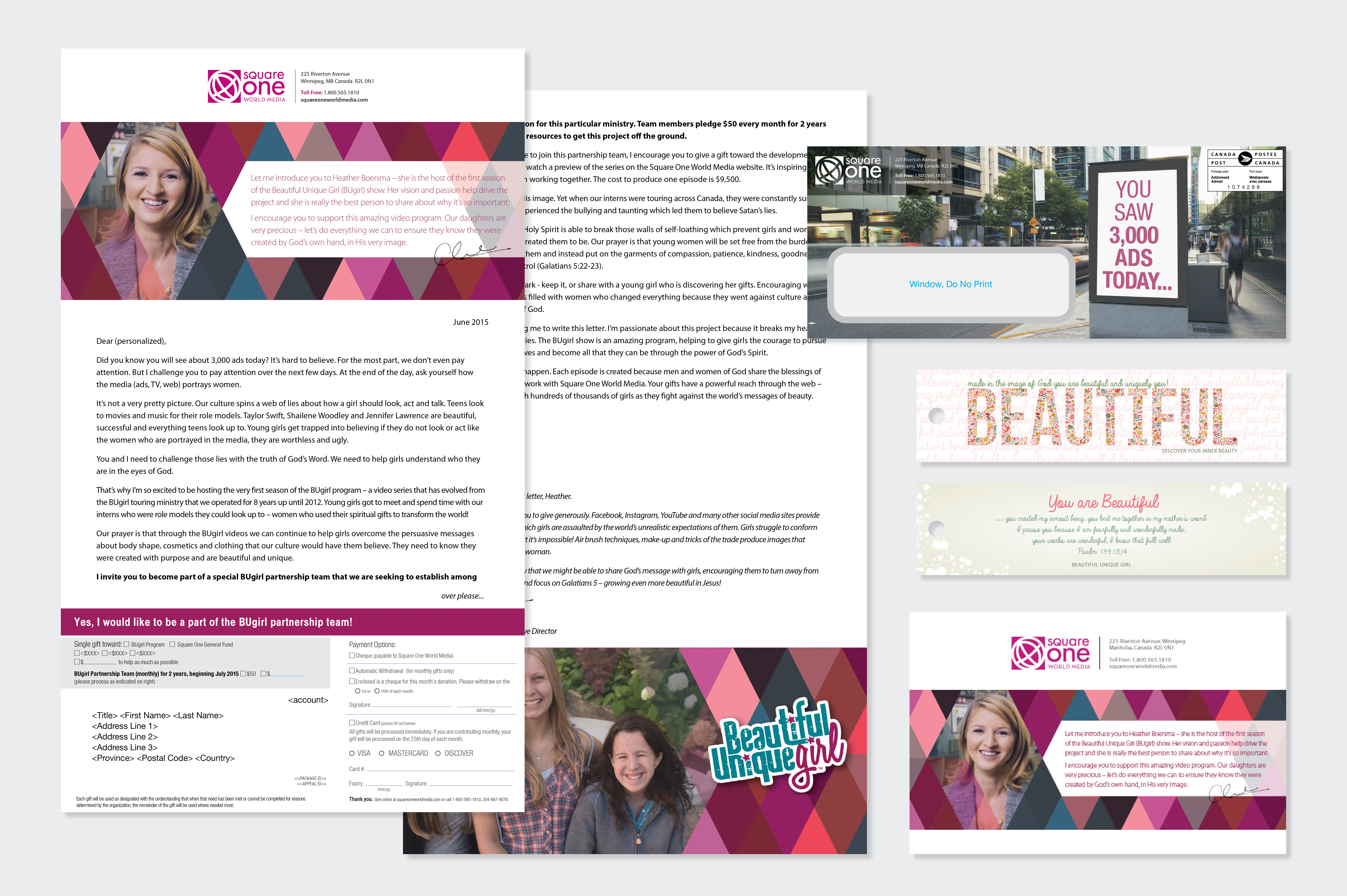 Square One’s direct mail featuring “Beautiful Unique Girl” was designed using some of their other brand pieces as inspiration. The letter and response device were both personalized at the printer and sent out in a custom printed #10 envelope. They also wanted a bookmark included as an incentive piece in this mailing as well as a follow up email header for an e-blast they would send out later.